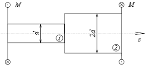 Ступенчатый вал круглого поперечного сечения скручивается моментами M. Если наибольшее касательное напряжение на первом участке равно τ_max, то наибольшее касательное напряжение на втором участке равно …