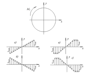Укажите правильную эпюру распределения касательных напряжений τ_max по поперечному сечению круглого вала при таком характере