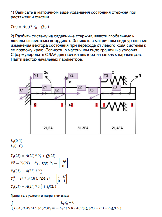 2) Разбить систему на отдельные стержни, ввести глобальную и локальные системы координат. Записать в матричном виде уравнения изменения вектора состояния при переходе от левого края системы к ее правому краю. Записать в матричном виде граничные условия. Сформулировать СЛАУ для поиска вектора начальных параметров. Найти вектор начальных параметров.