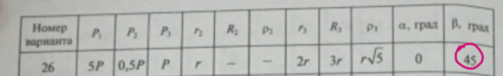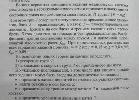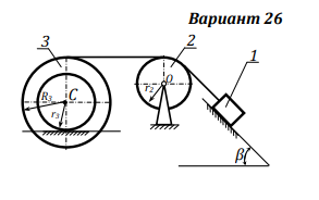 Груз 1 весом P1, привязанный к невесомой нерастяжимой нити, опускается по гладкой плоскости, образующей угол β с горизонтом. Второй конец нити намотан на одну из ступеней двухступенчатого блока 2. Вес блока 2 равен Р2, ; центр тяжести блока 2 лежит в точке O на его оси вращения Oz2. На другую ступень того же блока и на одну из ступеней двухступенчатого катка 3 намотана другая невесомая нерастяжимая нить. Каток 3 весом Р3 катится без скольжения по двум параллельным рельсам, образующим угол α с горизонтом. (В задачах № 13,14,15,16,25,26,28 принять α = 0°). Центр тяжести катка 3лежит в точке C на его оси Cz3. Блок 2 к каток 3 представляют собой двухступенчатые цилиндры радиусами ступеней r2, R2 и r3, R3 соответственно. Радиус инерции блока 2 относительно оси Oz2 равен ρ2; радиус инерции катка 3 относительно оси Cz3 равен ρ3. (В задачах № 1, 25 каток 3 считать однородным цилиндром радиуса r3; в задаче № 26 блок 2 считать однородным цилиндром радиуса r2). Решение Домашнего задание занимает 2 страницы листа А4 учитывая рисунки.