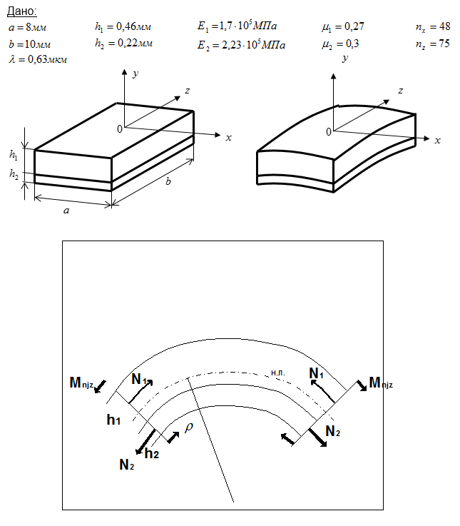 Вычислить нормальные напряжения σx и σz в кристалле и в кристаллодержателе после их соединения с помощью пайки или приклейки, если известны размеры сборки в длине a и b, толщина кристалла h1 и кристаллодержателя h2 , число интерференционных колец n1, n2 вдоль короткой и длинной сторон на изображении поверхности кристалла, полученном с помощью лазерного микроинтерферометра (λ= 0,63мкм), модуля упругости и коэффициенты Пуассона материала кристалла μ1 и кристаллодержателя μ2. Построить эпюры распределения напряжений σx и σz по толщине сборки.