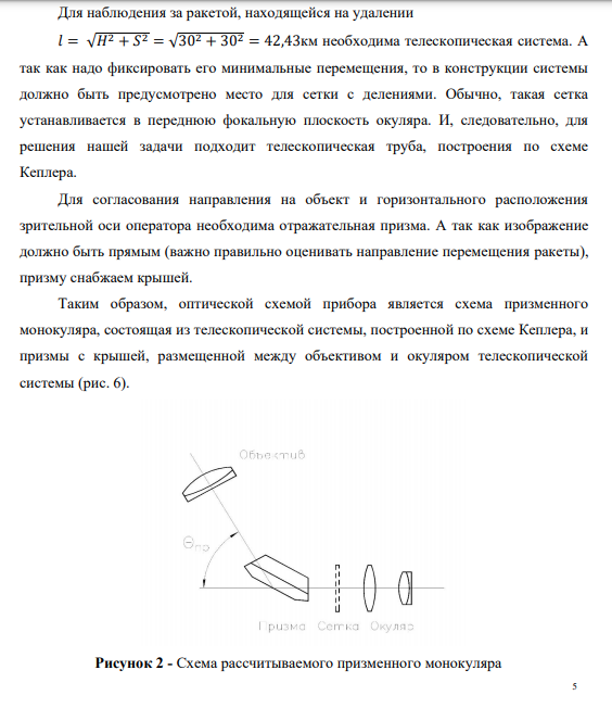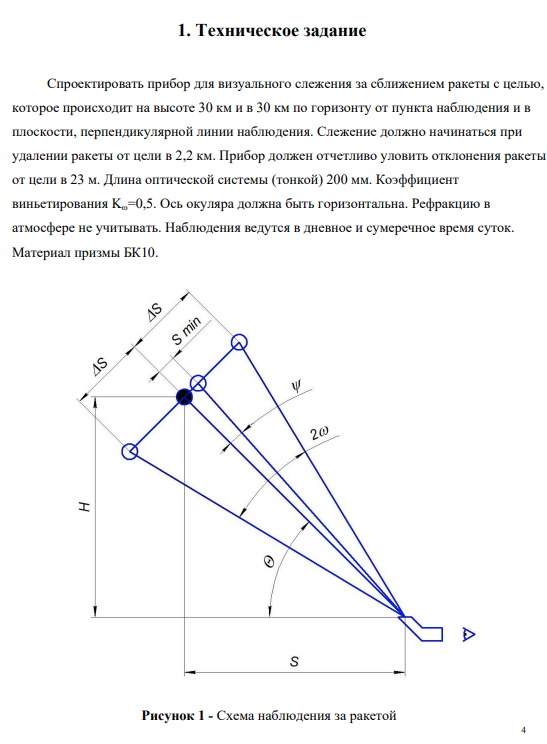 Спроектировать прибор для визуального слежения за сближением ракеты с целью, которое происходит на высоте 30 км и в 30 км по горизонту от пункта наблюдения и в плоскости, перпендикулярной линии наблюдения. Слежение должно начинаться при удалении ракеты от цели в 2,2 км. Прибор должен отчетливо уловить отклонения ракеты от цели в 23 м. Длина оптической системы (тонкой) 200 мм. Коэффициент виньетирования Kω=0,5. Ось окуляра должна быть горизонтальна. Рефракцию в атмосфере не учитывать. Наблюдения ведутся в дневное и сумеречное время суток. Материал призмы БК10.