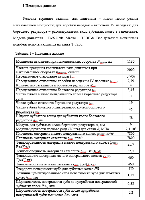 Условия варианта задания: для двигателя – имеет место режим максимальной мощности; для коробки передач – включена IV передача; для бортового редуктора – рассматривается вход зубчатых колес в зацепление. Модель двигателя – В-92С2Ф. Масло – ТСЗП-8. Все детали и механизмы подобны использующимся на танке Т-72Б3.