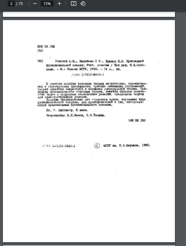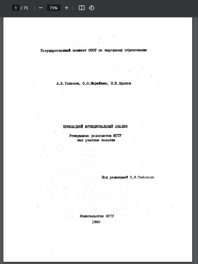 Голосов л.с., Нарейкин О.С., Храпов П.3. Прикладной функциональный анализ: Учеб. пособие / Под ред. С.К.Собо-- лева. - М.: Изд-во МГТУ, 1990. - 74 с., ил.