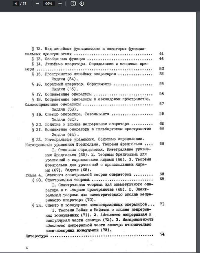 2. Спект- ральная теорема для симметрическото вполне непре рывного оператора (70). 99 65 68 888 68 § 24. Спектр и возмущения самосопряженных операторов... 71 1. Теоремы Вейля и Неймана о вполне непрерыв- ных возмущениях (71). 2. Абсолютно непрерывная и сингулярная части спектра (72). 3. Инвариантность абсолютно непрерывной части спектра относительно конечномерных возмущений (73). Литература ... 74 .