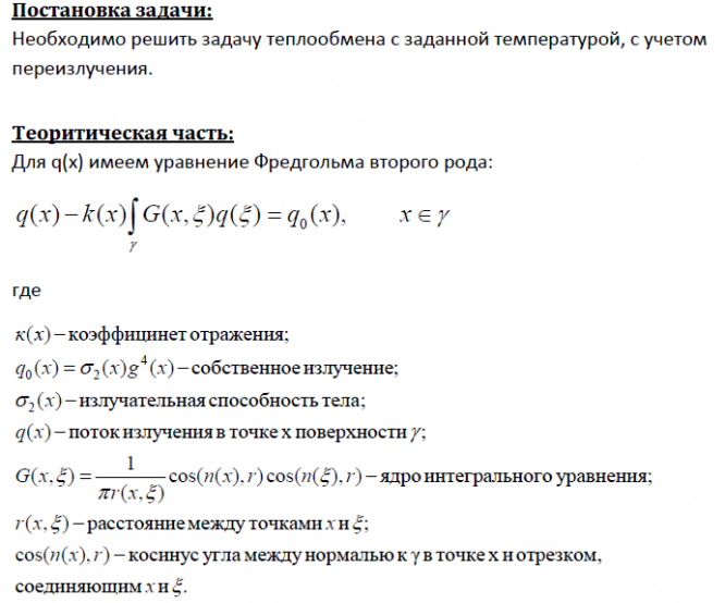 Задача: Решение задачи теплообмена с заданной температурой, с учетом переизлучения