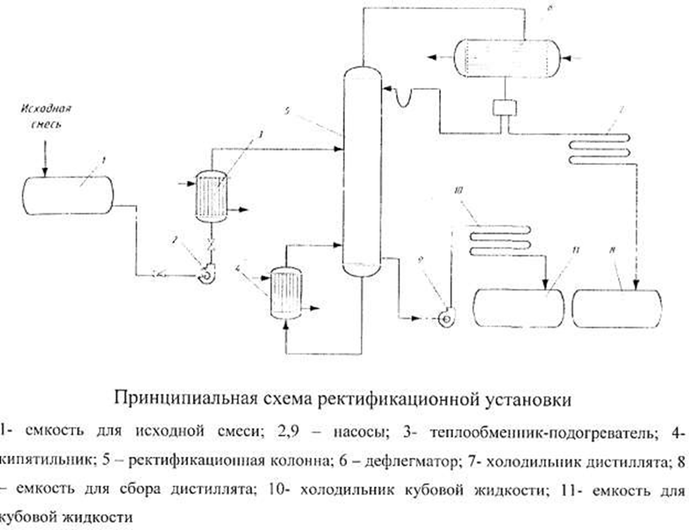 Исходная смесь из промежуточной емкости 1 насосом 2 подается в теплообменник 3, где она подогревается до температуры кипения. Нагретая смесь поступает на разделение в ректификационную колонну 5 на тарелку питания, где состав жидкости равен составу исходной смеси Хг.