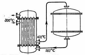 Кожухотрубчатый противоточный теплообменник (рис.) перед контактным аппаратом на сернокислотном заводе имеет поверхность теплообмена 360 ма. Очищенный газ колче­данных печей поступает в межтрубное пространство теплообмен­ника при 300 °С, выходит при 430 С. Горячий газ из контактного аппарата входит в трубы теплообменника при 560 °С. Расход газа 10 т/ч, удельная теплоемкость газа в среднем 1,05·103 Дж/(кг*К). Потери теплоты через кожух теплообменника составляют 10% от количества теплоты, полученного нагревающимся газом Определить коэффициент теплопередачи в тепло­обменнике.