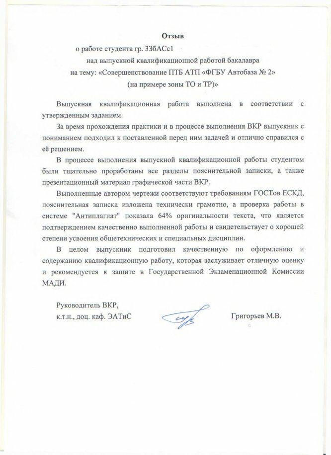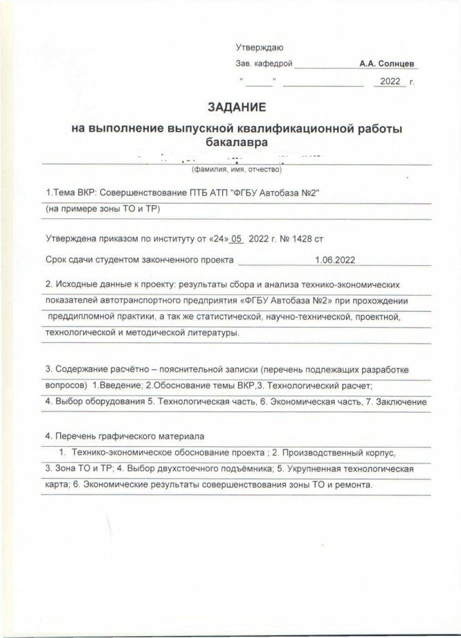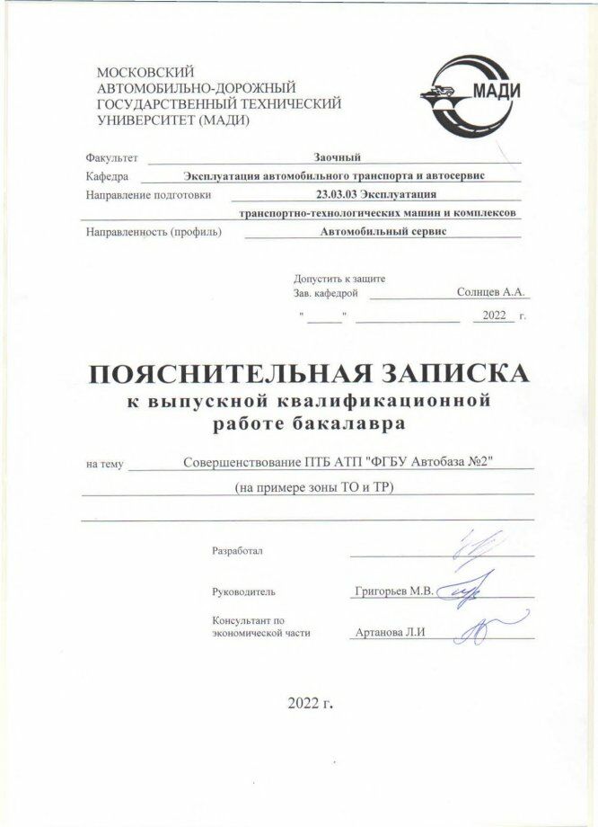 ВКР: Совершенствование ПТБ АТП "ФГБУ Автобаза №2" (на примере зоны ТО и ТР)