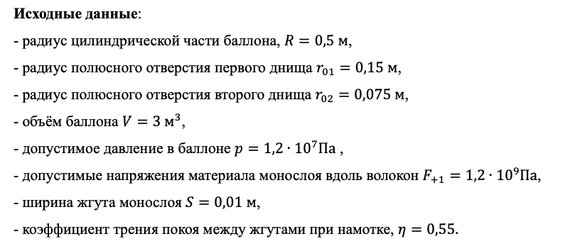 Спроектировать цилиндрический баллон давления, получаемый намоткой. Днища образованы только двойными спиральными слоями одной группы нитей. Цилиндрическая часть получается намоткой двойных спиральных слоёв одной группы нитей с днищами и кольцевой подмоткой второй группы нитей. Намотка днищ геодезическая, намотка двойных спиральных слоёв цилиндрической части по линии равного отклонения.