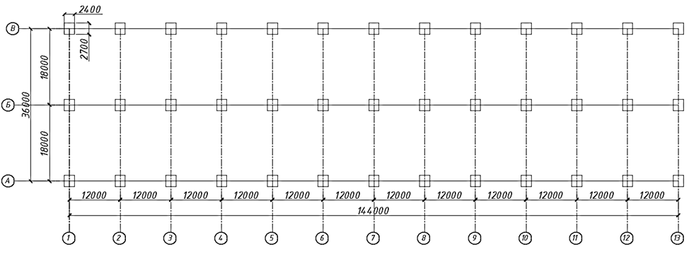 Запроектировать технологический процесс разработки грунта при устройстве столбчатых отдельно стоящих фундаментов под колонны каркаса промышленного здания. Здание 2-х пролетное, по 18 м каждый, шаг фундаментов - 12 м, количество шагов равно 12. Размеры фундаментов в плане 2,4´2,7 м, высота – 2,4 м. Тип грунта – песок. Отвоз грунта осуществляется автосамосвалами, расстояние перевозки грунта – 9,3 км. Материал дорожного покрытия – асфальтобетон. Работы ведут в две смены. План фундаментов представлен на рис. 1.