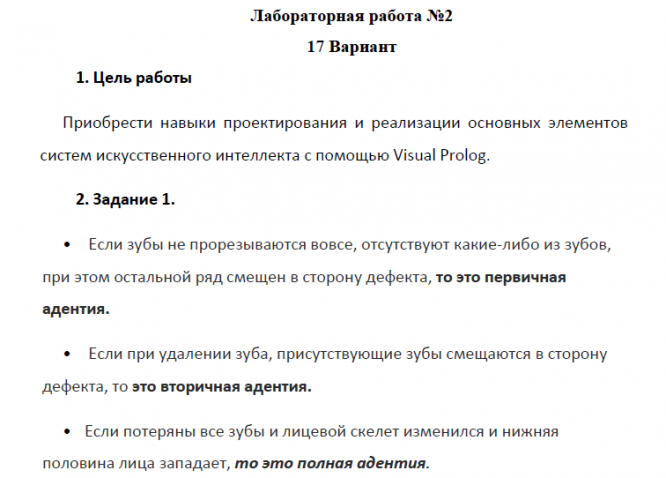 Главная » Учебные материалы » Проектирование интеллектуальных систем » Лабораторные работы » МГТУ им. Н.Э.Баумана » 9 семестр (1 семестр магистратуры) » Отчет по лабораторной работе №2 "Язык программирования Prolog применительно к системам искусственного интеллекта. 1 часть: Visual Prolog" (вариант №17)