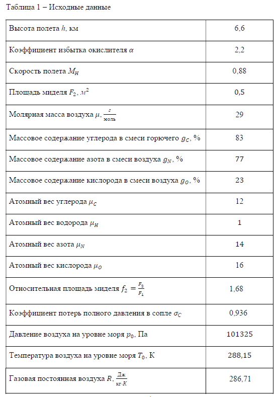 3 1. Исходные данные ................................................................................................ 4 2. Определение начальных данных ....................................................................... 6 2.1 Определение параметров воздуха на высоте ..................................... 6 2.2 Определение условное химической формулы топлива .................... 7 3. Определение оптимальной площади выходного сечения сопла ............... 9 3.1 Параметры потока во втором сечении ............................................... 9 3.2 Параметры потока в третьем сечении .............................................. 12 3.3 Параметры потока в четвертом сечении ........................................