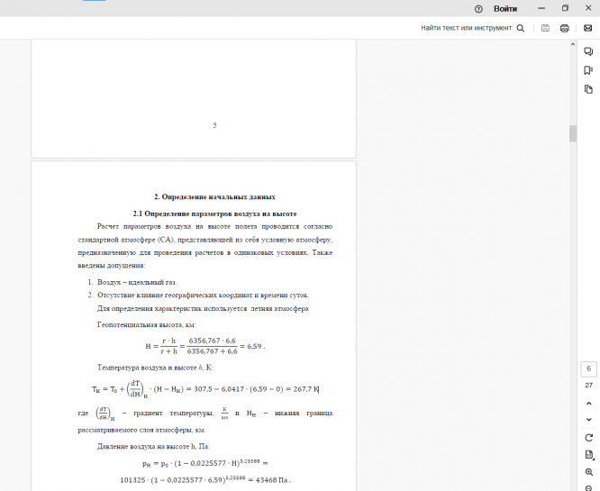 Также введены допущения: 1. Воздух – идеальный газ. 2. Отсутствие влияние географических координат и времени суток. Для определения характеристик используется летняя атмосфера Геопотенциальная высота, км: H = r ⋅ h r + h = 6356,767 ⋅ 6,6 6356,767 + 6,6 = 6,59 . Температура воздуха н высоте ℎ, К: T􀭌 = T􀬴 + 􀵬 dT dH 􀵰 􀭌 ⋅ (H − H􀭌) = 307,5 − 6,0417 ⋅ (6,59 − 0) = 267,7 К где 􁉀 􀭢􀭘 􀭢􀭌 􁉁 􀭌 – градиент температуры, К км и H􀭌 – нижняя граница рассматриваемого слоя атмосферы, км..