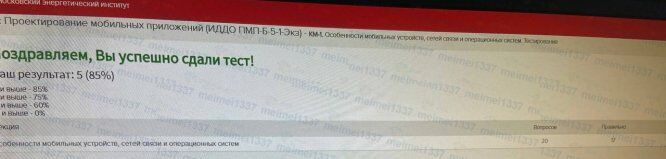 Главная » Учебные материалы » Проектирование мобильных приложений » Ответы (шпаргалки) » ИДДО НИУ «МЭИ» » Несколько классов/семестров » Номер КМ-1 » К заданиям » КМ-1. Особенности мобильных устройств, сетей связи и операционных систем. Тестирование - 85%