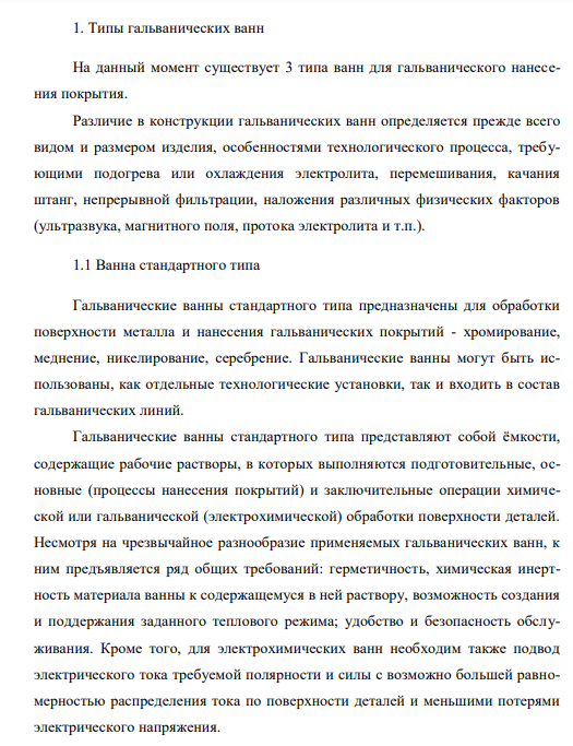 Электрохимические ванны играют важную роль для обработки металлических изделий гальваническим методом. Он заключается в покрытии металлов созданными на основе некоторых химических веществ растворами. Не редко для этой цели применяются электролиты. На производственных предприятиях, которые специализируются на изготовлении гальванических ванн, используют в основном материалы, созданные на основе стекла и пластика. Гальванические ванны предназначены для подготовительных, основных (процесс покрытия) и заключительных операции электрохимической (гальванической) обработки поверхности изделий. Ванна является основным элементамом гальванического модуля. Гальваническая ванна должна соответствовать необходимымы требованиям, таким как герметичность, стойкость к агрессивным средам, безопасность. Ванны могут различаться по конструкции в зависимости от технологического процесса, издели, на которое требуется нанести покрытие, температу электролита, способа циркуляции раствора, анодов и т. д. Для более равномерного и качественного осаждения также следует использовать систему фильрации и защитные экраны.