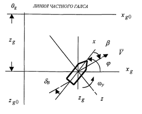 Описание объекта управления: Динамика судна, как и любого физического тела, подчиняется второму закону Ньютона. Силы и моменты, действующие на судно, в свою очередь, описываются законами гидродинамики. Соотношения между кинематическими параметрами движения ( - угол рыскания, - угловая скорость рыскания, - угол дрейфа, - угол перекладки руля) показаны на рисунке 1.
