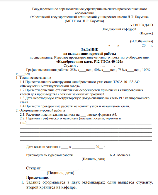 ЗАДАНИЕ на выполнение курсовой работы по дисциплине: Курсовое проектирование основного прокатного оборудования «Калибровочная клеть Р12 ТЭСА 40-133»