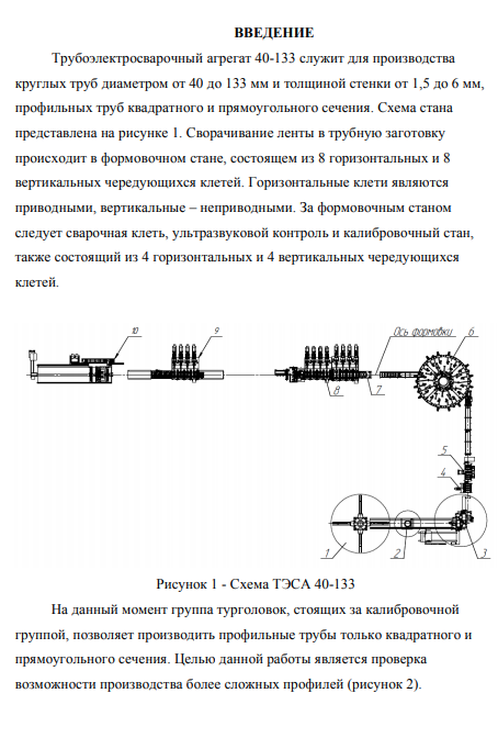 Трубоэлектросварочный агрегат 40-133 служит для производства круглых труб диаметром от 40 до 133 мм и толщиной стенки от 1,5 до 6 мм, профильных труб квадратного и прямоугольного сечения. Схема стана представлена на рисунке 1. Сворачивание ленты в трубную заготовку происходит в формовочном стане, состоящем из 8 горизонтальных и 8 вертикальных чередующихся клетей. Горизонтальные клети являются приводными, вертикальные – неприводными. За формовочным станом следует сварочная клеть, ультразвуковой контроль и калибровочный стан, также состоящий из 4 горизонтальных и 4 вертикальных чередующихся клетей.