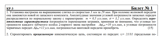 Условие. В установке выращивания монокристалла вместо вышедшей из строя волновой передачи устанавливается новая передача из запасного комплекта. Амплитудные значения угловой погрешности запасных передач распределяются по нормальному закону с параметрами: m = 0,5 угл.мин, s = 1,2 угл.мин. Определить ожидаемую предельную погрешность перемещения затравки, принимая во внимание, что угловые погрешности зубчатых передач Djзуб.=10 угл.мин, а угловые погрешности червячных передач Dj2=12 угл.мин, погрешностью винтовой передачи пренебречь. Затравка перемещается на 3 мм за 29 мин.