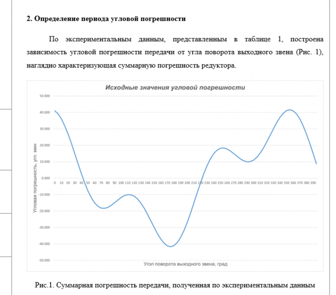 - Используя результаты спектрального анализа, сравнить расчетные значения угловой погрешности редуктора и экспериментальные данные. Найти среднее значение погрешности и стандартное отклонение расчётных значений от экспериментальных;