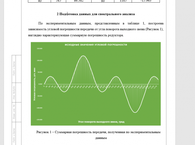 - Используя результаты спектрального анализа, сравнить расчетные значения угловой погрешности редуктора и экспериментальные данные. Найти среднее значение погрешности и стандартное отклонение расчётных значений от экспериментальных;