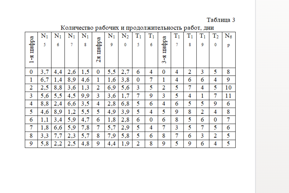 Плановый отдел компании собрал полную информацию о видах и параметрах основных годовых работ. Известны технологическая последовательность работ, а также их продолжительность Тn, минимальное количество необходимых рабочих и фактически имеющееся количество исполнителей по каждой работе Nn. Номер схемы задания и исходные данные представлены в табл. 1–3. Определите параметры сетевого графика: ранний срок свершения события tip; поздний срок свершения события tiп; резерв времени события ri; полный резерв времени работы rп, свободный резерв времени работы rсв, частный резерв времени работы rч. Постройте сетевой график в масштабе времени по ранним срокам свершения работ. .