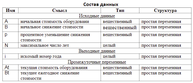 А — начальная стоимость оборудования. В первый год эксплуатации стоимость оборудования снижается на В руб., а в каждый следующий год снижение стоимости уменьшается на р % (относительно предыдущего года). Определить, через сколько лет стоимость оборудования станет меньше А/2. Рассматривать срок не более N лет.
