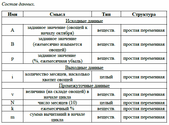 К началу октября на овощном складе хранилось А т овощей. Ежемесячно должно изыматься В т для продажи. Естественная ежемесячная убыль предполагается постоянной и равной р %. Определить, на сколько месяцев хватит запаса овощей. Вычисления досрочно прекратить после рассмотрения десятого месяца хранения (июля).