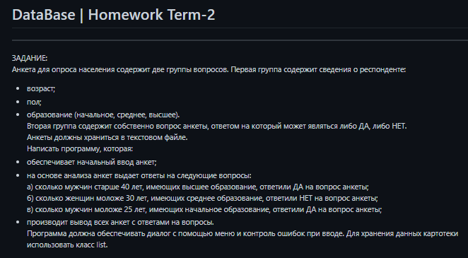 Для студентов МГТУ им. Н.Э.Баумана по предмету Программирование на основе классов и шаблоновДомашнее задание ИУ5 (Анкета для опроса населения)Домашнее задание ИУ5 (Анкета для опроса населения)