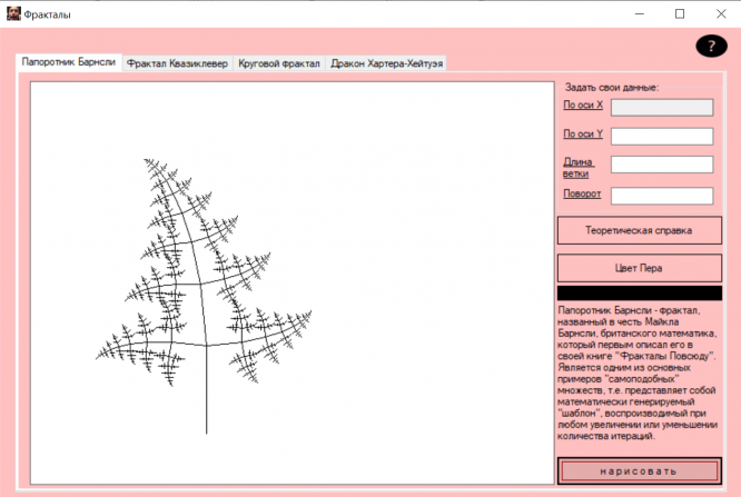 В файле предоставлен программный проект выполненный на языке C#. В работе выполнено построение 4 различных фракталов, с заданием каждому параметров или построение по умолчанию, так же в каждом окне приведена справка с теоретическими материалам.