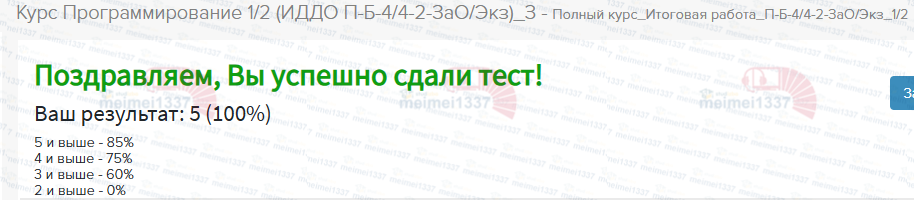 Главная » Учебные материалы » Программирование » Ответы » ИДДО НИУ «МЭИ» » Несколько классов/семестров » Номер Экзамен » К экзамену » Курс Программирование - Полный/Аттестационный курс Итоговая работа