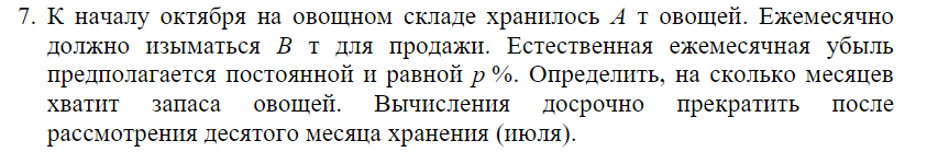 предполагается постоянной и равной р %. Определить, на сколько месяцев хватит запаса овощей. Вычисления досрочно прекратить после рассмотрения десятого месяца хранения (июля).