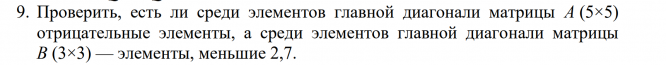 Проверить, есть ли среди элементов главной диагонали матрицы А (5х5) отрицательные элементы, а среди элементов главной диагонали матрицы В (3x3) - элементы, меньшие 2,7.