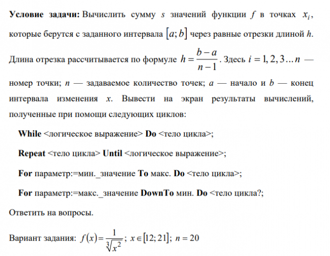 Условие задачи: Вычислить сумму s значений функции f в точках i x , которые берутся с заданного интервала a; b через равные отрезки длиной h. Длина отрезка рассчитывается по формуле . Здесь i = 1, 2, 3... n — номер точки; n — задаваемое количество точек; a — начало и b — конец интервала изменения x. Вывести на экран результаты вычислений, полученные при помощи следующих циклов: While <логическое выражение> Do <тело цикла>; Repeat <тело цикла> Until <логическое выражение>; For параметр:=мин._значение To макс. Do <тело цикла>; For параметр:=макс._значение DownTo мин. Do <тело цикла?;