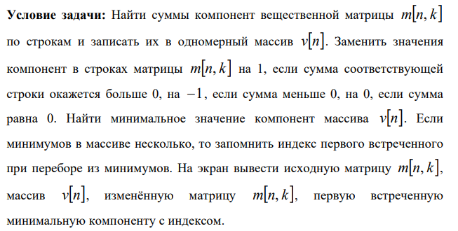 Условие задачи: Найти суммы компонент вещественной матрицы m n, k по строкам и записать их в одномерный массив v n . Заменить значения компонент в строках матрицы m n, k на 1, если сумма соответствующей строки окажется больше 0, на 1 , если сумма меньше 0, на 0, если сумма равна 0. Найти минимальное значение компонент массива vn . Если минимумов в массиве несколько, то запомнить индекс первого встреченного при переборе из минимумов. На экран вывести исходную матрицу mn, k, массив vn , изменённую матрицу mn, k , первую встреченную минимальную компоненту с индексом.