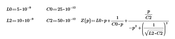 1. По заданной функции входного сопротивления построить первую каноническую схему Фостера. Записать общий вид функции входного сопротивления. Построить частотную зависимость функции входного сопротивления, самостоятельно выбрав значения номиналов (для индуктивностей в пределах единиц–десятков нГн, для емкостей – десятков–сотен пФ).