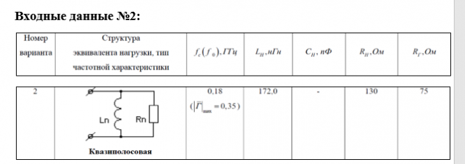 1. Выполнить расчет параметров двухэлементной СЦ лестничной структуры для согласования заданной нагрузки и сопротивления генератора. Привести результирующую схему СЦ с указанием номиналов элементов, а также график частотной зависимости модуля коэффициента отражения |Г| в полосе согласования.