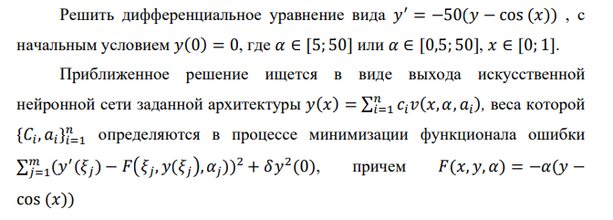 Решить дифференциальное уравнение вида, с начальным условием 𝑦(0) = 0, где 𝛼 ∈ [5; 50] или 𝛼 ∈ [0,5; 50], 𝑥 ∈ [0; 1]. Приближенное решение ищется в виде выхода искусственной нейронной сети заданной архитектуры 𝑦, веса которой определяются в процессе минимизации функционала ошибки