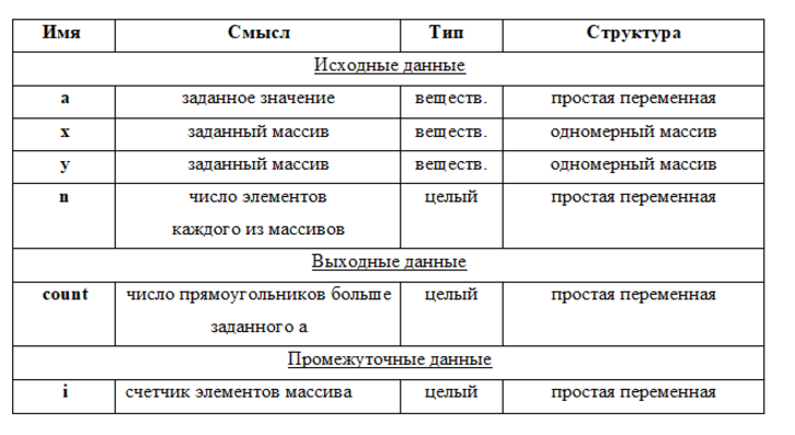 Показать/скрыть дополнительное описаниеВ приведенных ниже задачах значения A, B (если они есть в варианте) и вектора X и (или) Y задаются вводом; n — размер каждого из векторов X и Y. 5. Каждая пара (Xk, Yk) задает длины сторон прямоугольника; найти число тех прямоугольников, площадь которых больше A..
