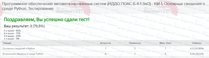Курс Программное обеспечение автоматизированных систем - КМ-1. Основные сведения о среде Python. Тестирование - 70.5%
