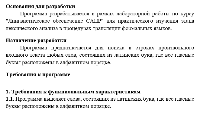 Разработать лексический анализатор для поиска в строках произвольного входного текста любых слов, состоящих из латинских букв, где все гласные буквы расположены в алфавитном порядке. Строки входного текста должны передаваться лексическому анализатору через поток стандартного ввода. Результаты поиска должны отображаться в одну колонку потока стандартного вывода.