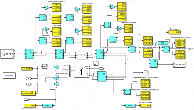 В данной работе представлена модель сети с источником распределённой генерации, разработанная в программе Matlab/Simulink, на рисунке 1. Схема включает в себя блоки, отвечающие за различные аспекты управления, такие как генерация сигнала, преобразование данных и выведение результатов измерения.