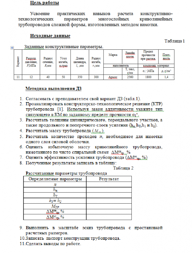 ДЗ 1: Расчет конструктивно-технологических параметров криволинейного трубопровода из ПКМ вариант 11