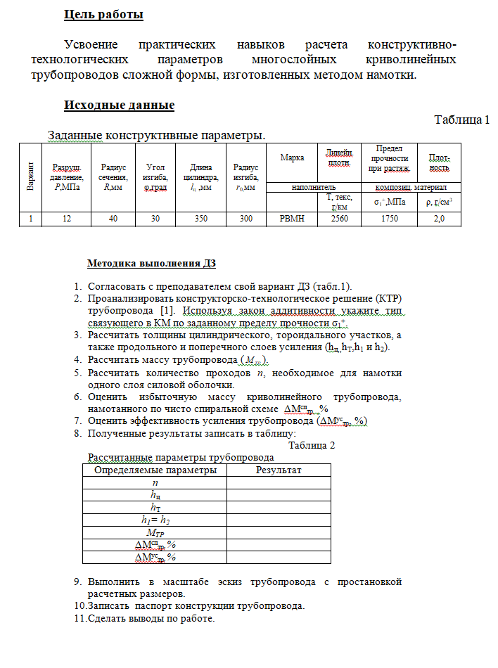 ДЗ 1: Расчет конструктивно-технологических параметров криволинейного трубопровода из ПКМ вариант 1