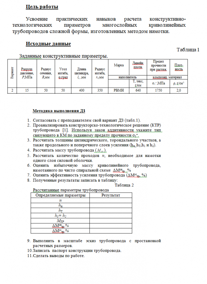 ДЗ 1: Расчет конструктивно-технологических параметров криволинейного трубопровода из ПКМ вариант 2