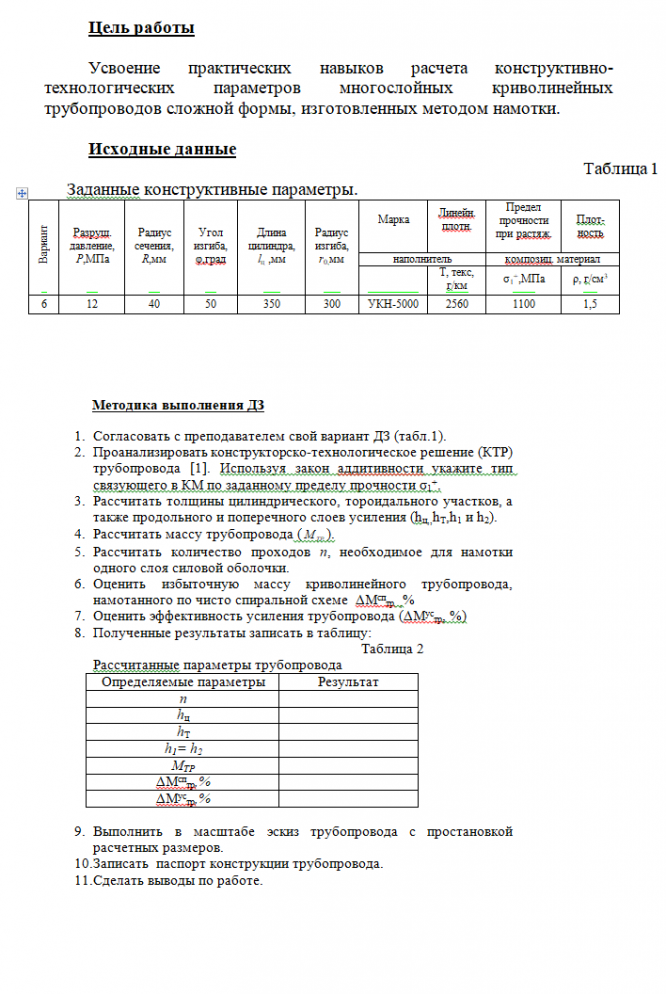 ДЗ 1: Расчет конструктивно-технологических параметров криволинейного трубопровода из ПКМ вариант 6