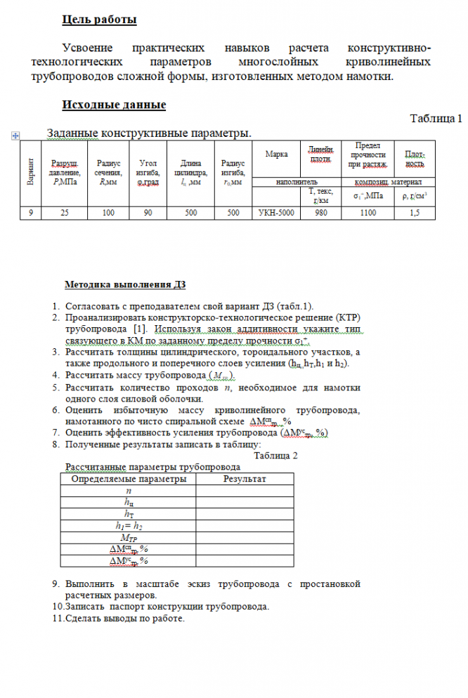 ДЗ 1: Расчет конструктивно-технологических параметров криволинейного трубопровода из ПКМ вариант 9