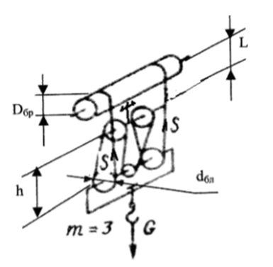 Определить канатоёмкость полиспастной системы при замене грузового каната крана Lкан, если известно: высота подъёма груза h = 16 м, L1=1500 мм, диаметр каната dк=16,5 мм. Расчётная схема представлена на рисунке 4.
