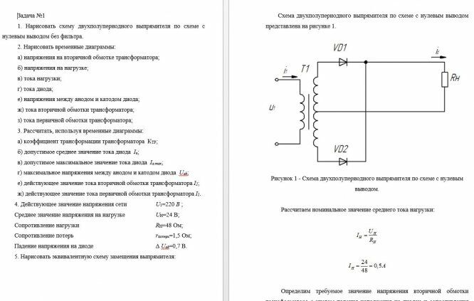 Схема двухполупериодного выпрямителя по схеме с нулевым выводом представлена на рисунке 1.